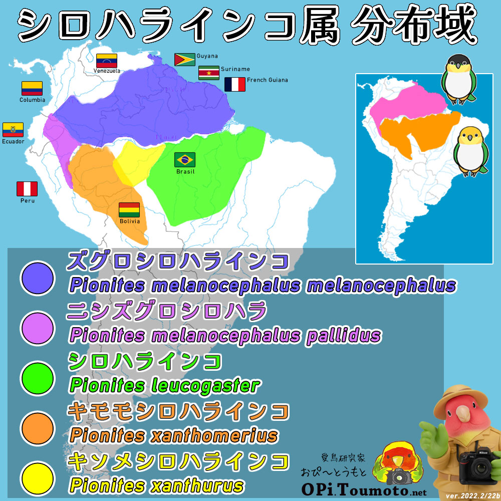 シロハラインコ属全体での分布国は9カ国 🇧🇷 🇬🇫 🇬🇾 🇸🇷 🇻🇪 🇨🇴 🇪🇨 🇵🇪 🇧🇴 🇻🇪