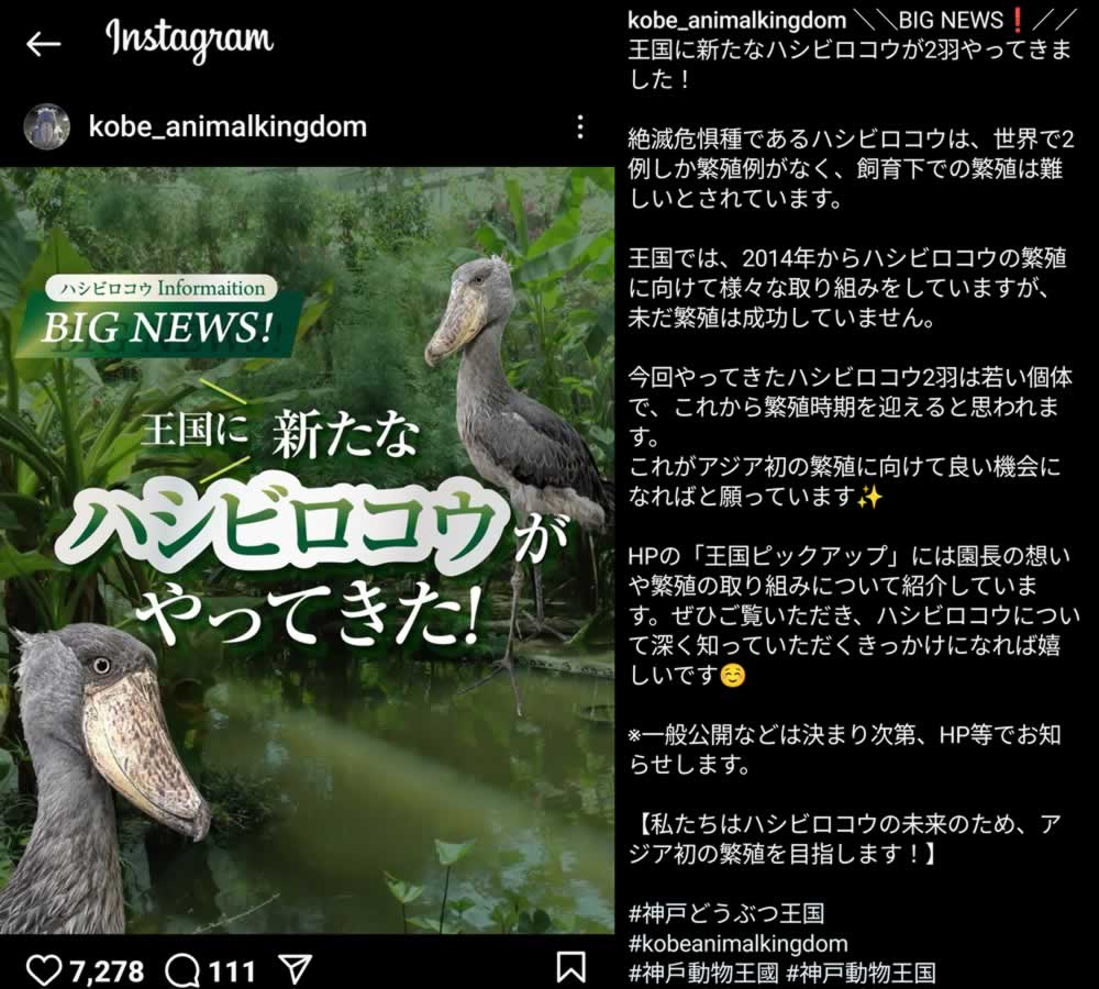 2025年5月21日、神戸どうぶつ王国に新たなハシビロコウがやってきた!とSNS告知がありました。